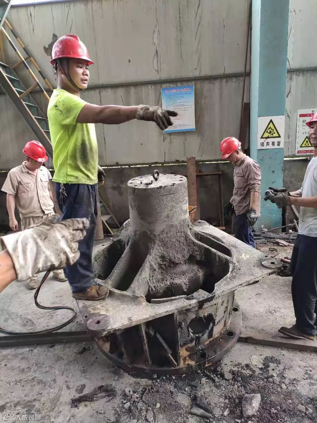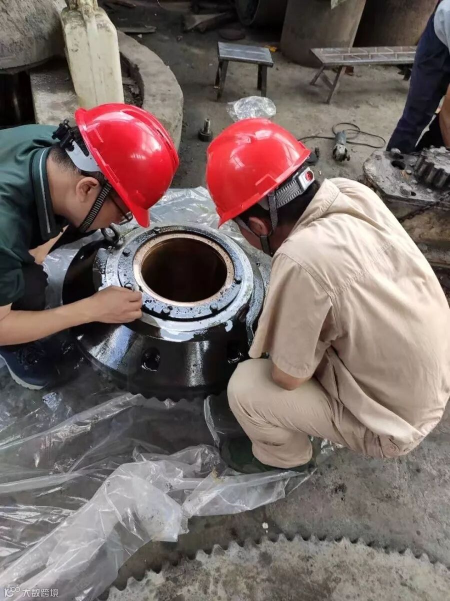 为加快安装进度,尽快恢复生产,除选矿厂破碎段的维 修钳工外,从宝山选厂抽调四名维修钳工及球磨段维修钳工巫国华来支援安装。设备副总经理曾盘生,机动部长李志满亲临现场,与厂家神霸矿机厂家售后工程师梁智共同指导安装。由于GP100S圆锥破碎机使用时间较长,部件老化磨损严重,安装中难免会出现零部件配合尺寸达不到配合要求的情况。为此,大家共同想办法、出主意,保证每一个零部件的配合尺寸与安装数据达到设计使用要求。在安装主轴铜套的时候,因为存在配合公差,又无专业压力设备,难以顺利装配,曾总于是从食堂调运冰柜,采用冷冻收缩的原理,最终顺利的将铜套装入下机体内。