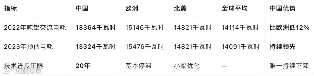 葛红林点评:欧洲吨铝电耗即使2021年较低时也比中国同期高出1600多千瓦时,过去25年间欧盟电解铝生产的耗电量基本保持不变,出现了令人难以想象的"不进步"现象。