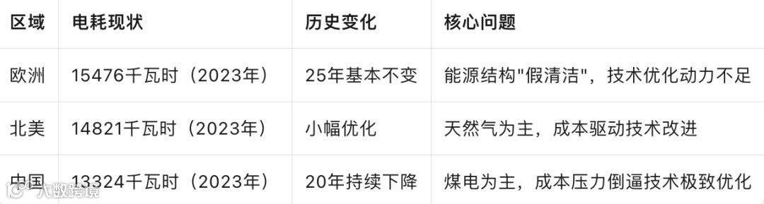 关键悖论:中国电耗最低,但碳排最高;欧洲电耗高,但碳排低——能源结构决定碳排,技术效率决定电耗。