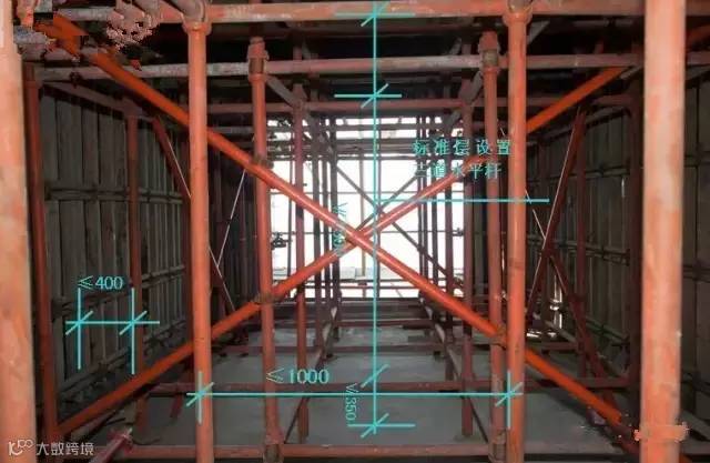 1.2 架子立杆高度应选择比楼层净空高度低400mm左右的钢管;标准层应设置三道纵横向水平管,扫地杆离地不得超过200(碗扣件离地不得超过350),钢管上端自由端不得超过500,可调U型顶托螺纹部分不得超过250。