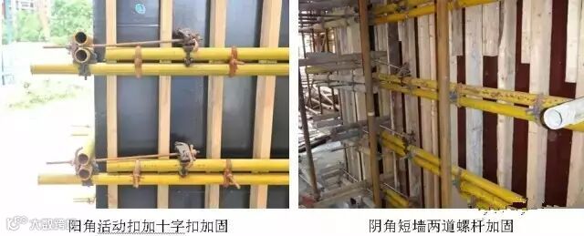 4.5 剪力墙阴角加固:剪力墙阴角处必须采用两道穿墙螺杆加固,长方向阴角处穿墙螺杆应加长加固短方向端头板。