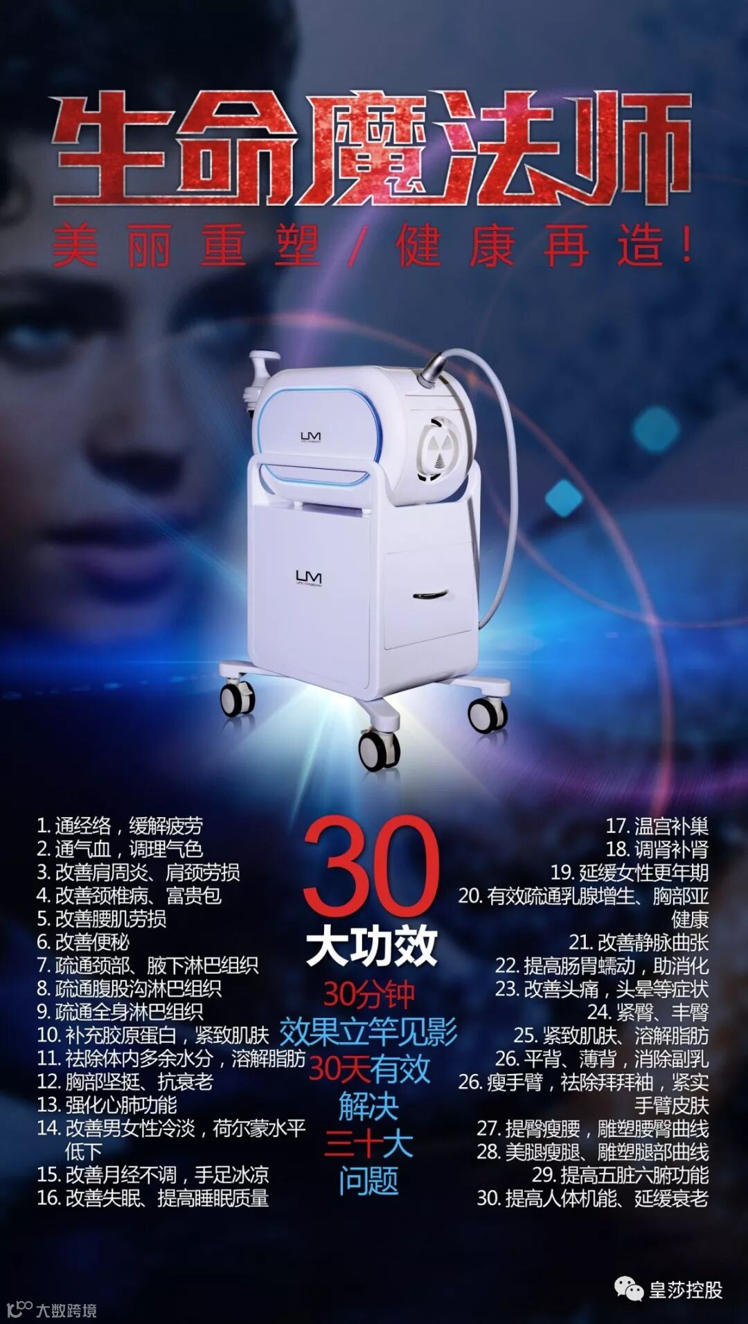 皇莎生命魔法师用四年的时间火爆了整个美业,独特的脉动能量疗法能直达筋膜,重构人体健康,不吃药不打针无创伤,便能实现预测、预警、预知、预防,从源头上预防肿瘤及各种慢性隐形疾病,有效改善亚健康,是最新一代的高智能养生科技。