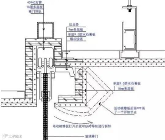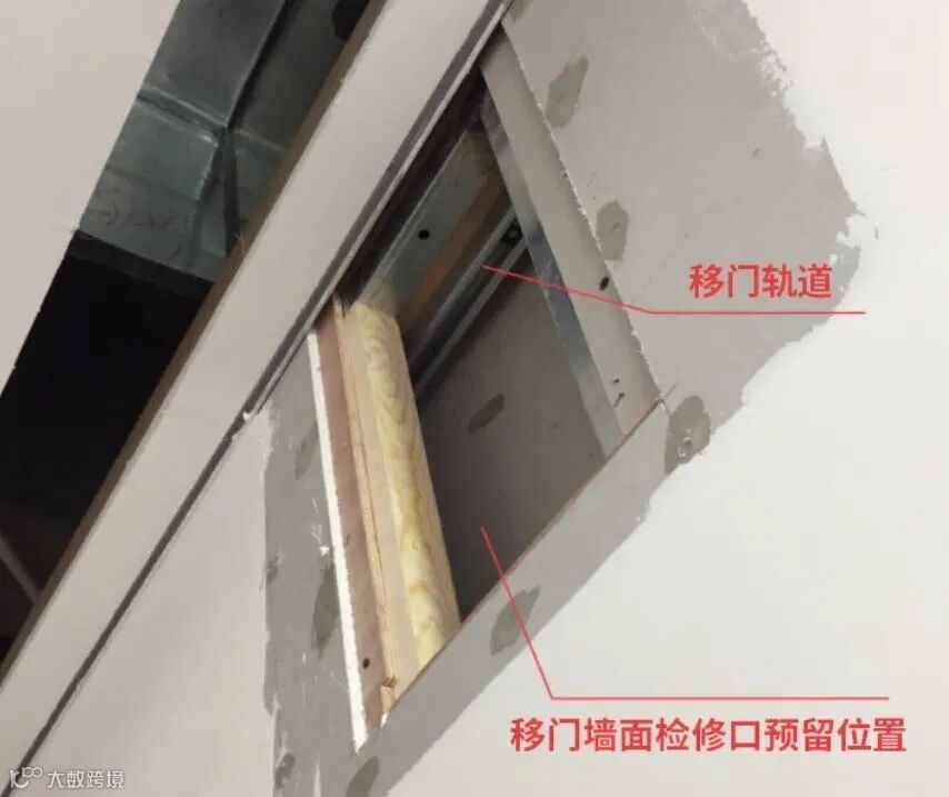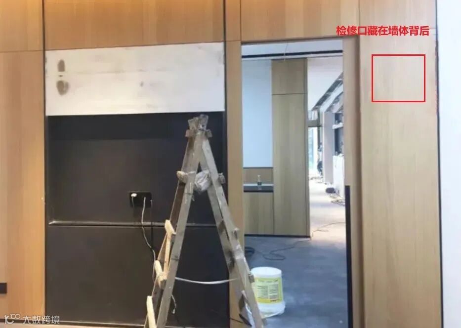 高端室内精装项目往往对设备的“可检修性”要求较高,“暗藏式”轨道移门施工检修时更要考虑,往往会在顶面或墙面设置检修口。