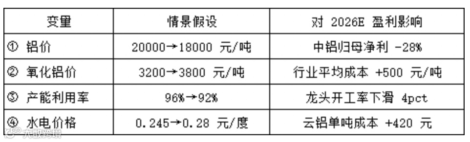 基准情景:铝价 19,500、氧化铝 3,400、产能利用率 94%,龙头 2026E 净利仍有望持平 2025,高股息继续 。