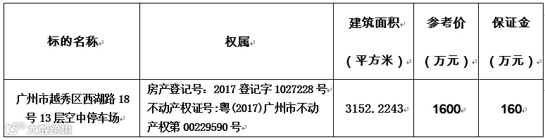 1、本次拍卖标的物为广州市越秀区西湖路18号13层空中停车场(广百百货),自编车位数量101个(具体车位数量以现场实物为准),建筑面积为3152.2243平方米。