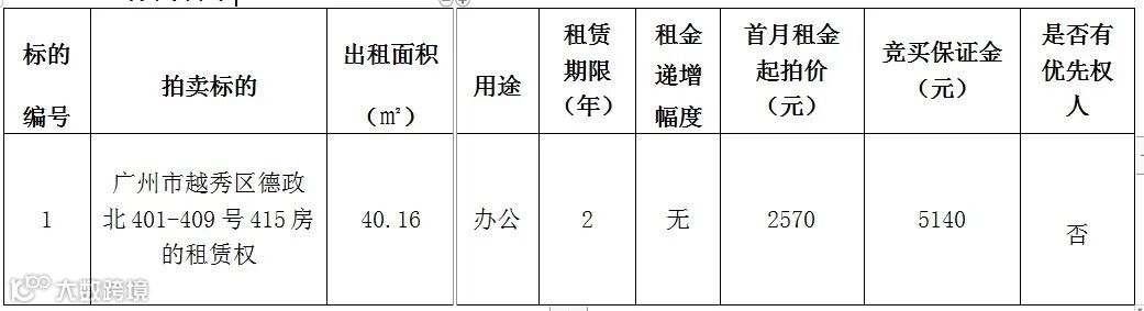 五、上述标的《广州市越秀区德政北路401-409号415房租赁权拍卖标的情况及特别说明》、《广州市房屋租赁合同(模板)》样本及《拍卖规则和注意事项》等资料请登录交易平台详细查看本公告附件内容。