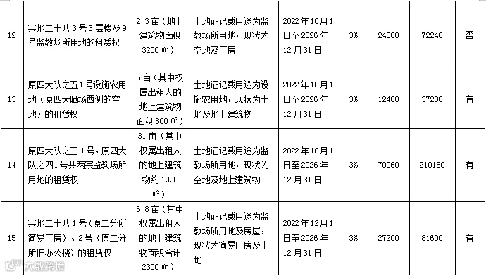 9、标的13出租总面积3333.35㎡,地块上只有约800㎡的建筑物权属出租人,该建筑物在投入使用前需由买受人自行进行必要的维修和加固。其余建筑物权属原租户,买受人竞得后可与原租户协商转让事宜,协商不成的,原租户可自行拆除。该地块出租人暂无电力供应,需由买受人自行解决,地块所需用水需自行出资到250米外的主水管接入。
