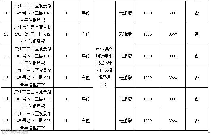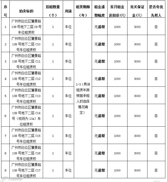 2、根据《中华人民共和国物权法》第七十四条“建筑区划内,规划用于停放汽车的车位、车库应当首先满足业主的需要。”的规定,竞买人同时须为广州市白云区麓景路麓湖大厦小区的业主,且每户只能承租一个车位。