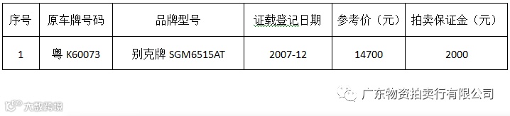 展示时间:2019年2月25、26日,展示地点:标的现场,具体展示时段请咨询。标的按现状拍卖,对标的有意者须于2019年2月27日中午12时前,将竞买保证金汇达我司帐户(以到帐为准,户名:广东物资拍卖行有限公司,开户行:中国银行广州大东门华庭支行,帐号:691257760207,注明汇款用途:竞买保证金);并于2019年2月27日下午4时前将银行汇款回单、竞买人身份资料(个人:居民身份证,单位:营业执照等)、用户名、电话和竞买标的序号传真至本公司。有关网上拍卖系统的具体操作办法,请与本公司联系及查阅以下公司网址(www.gdwz-auction.com)。