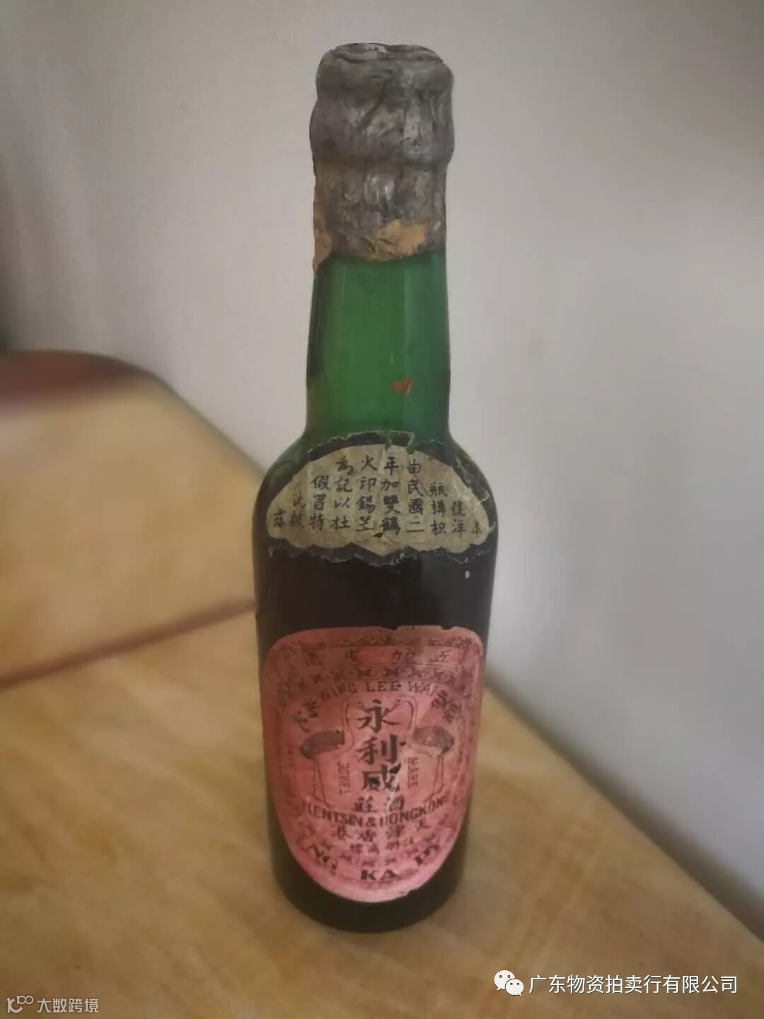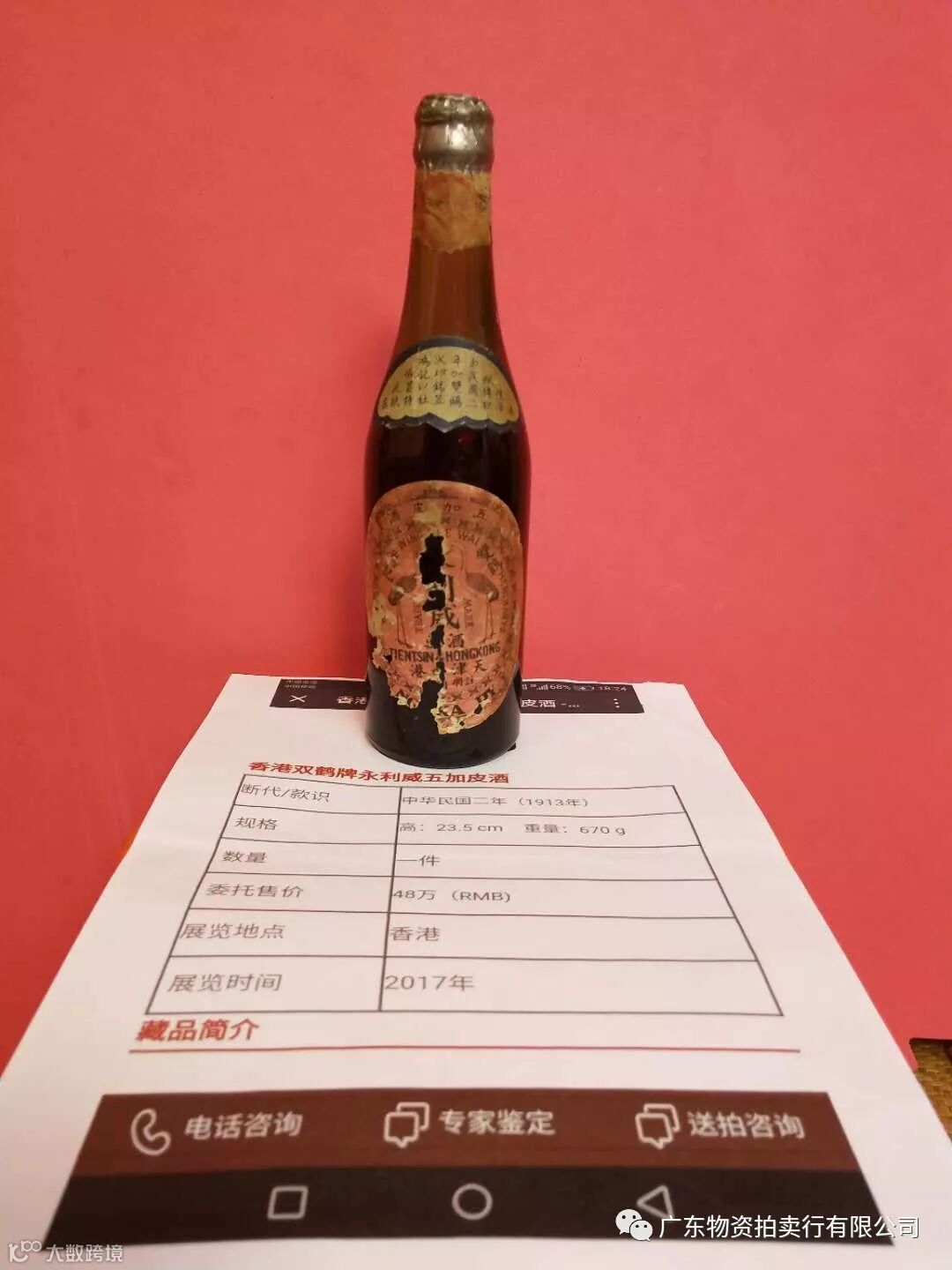 广东物资拍卖行有限公司香港双鹤牌永利威五加皮酒(中华民国二年,1913年)。2017年在香港以人民币48万元拍卖一支,现有一支我司准备近期拍卖。