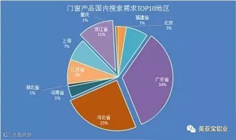 从图表中得知,国内对门窗需求量比较高的省份是广东省(34%)、河北省(25%)、浙江省(11%)等地区,珠三角、长三角、环渤海地区作为经济发达区域需求量占比也是居高不下,目前虽然国家宏观经济增速放缓,但房地产行业还远没到触底的阶段,发展将会保持很长一段时间,门窗作为房屋必不可少的构造,在接下来的很长一段时间内将会继续保持高速增长的态势。