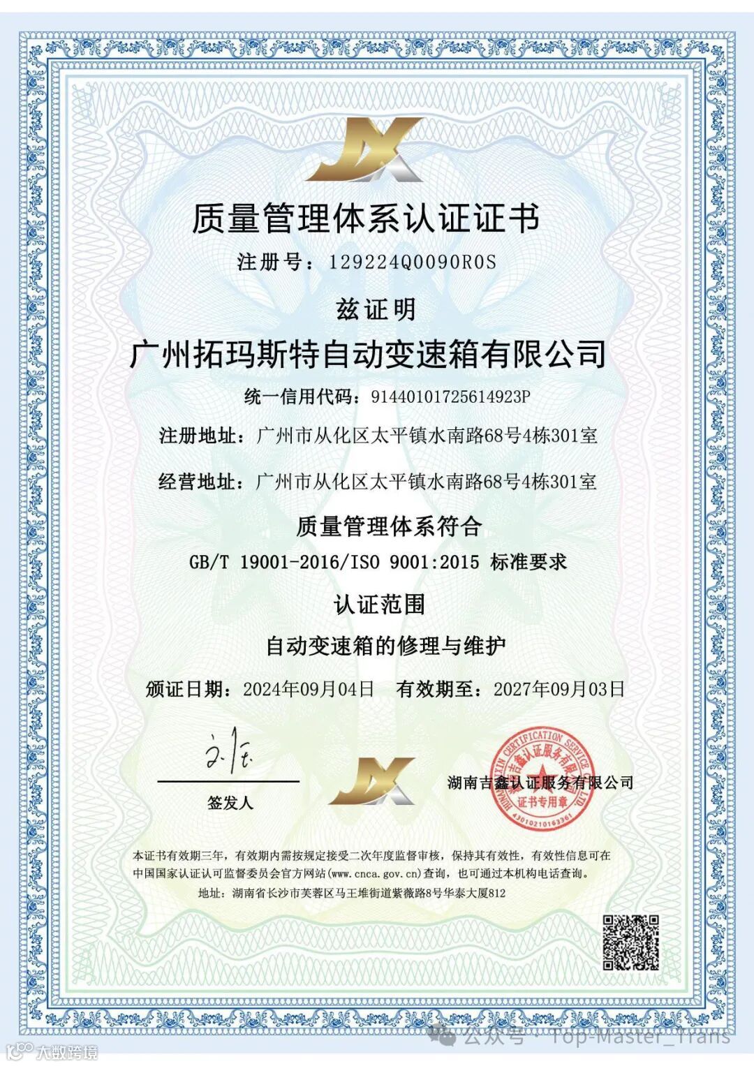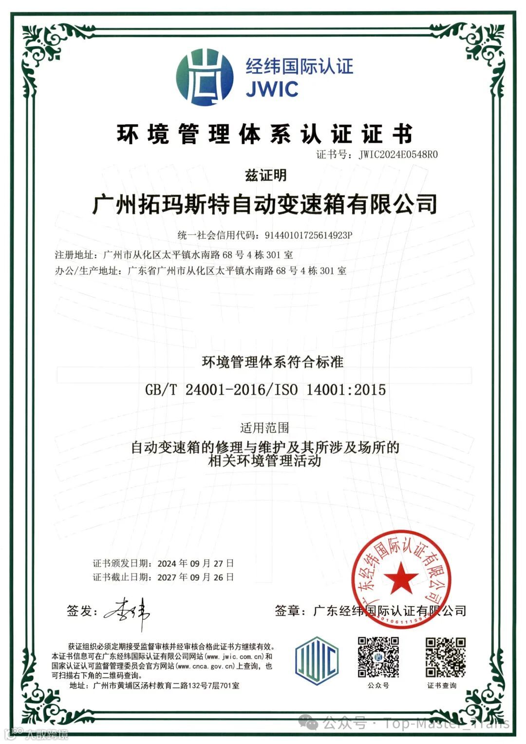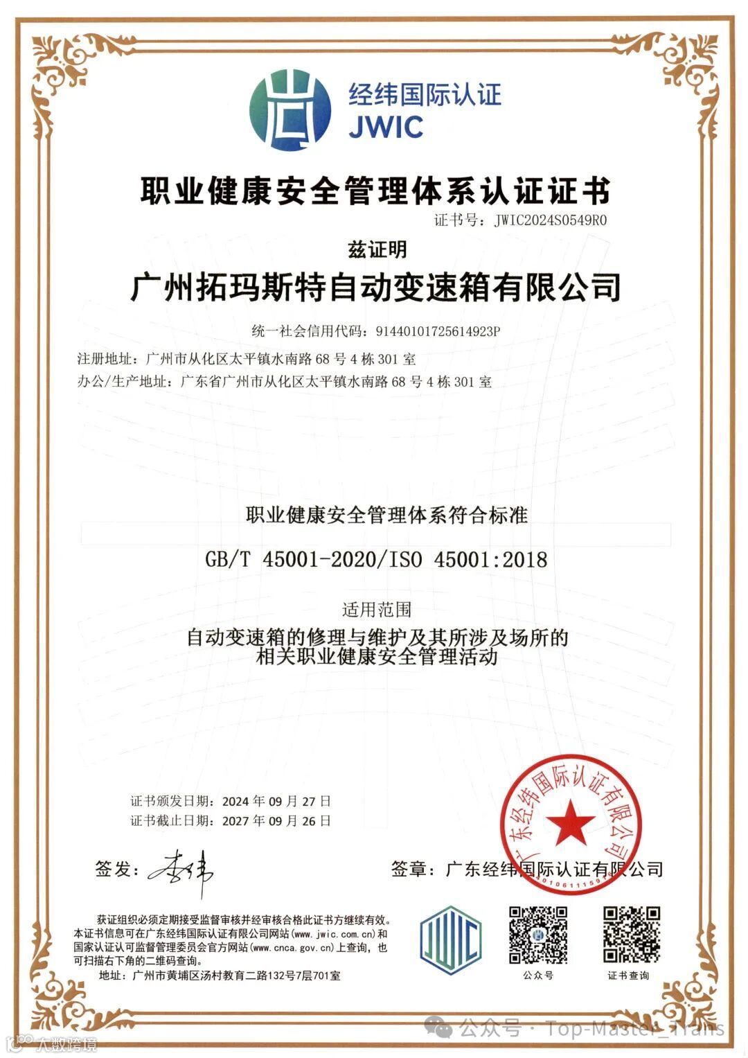 近期,广州拓玛斯特自动变速箱有限公司成功获得了新的管理体系认证证书,包括:ISO14001环境管理体系认证证书、ISO45001职业健康安全管理体系认证证书,另外,公司的ISO9001质量管理体系认证证书也完成了更新。公司将严格执行这些管理体系的各项要求,为新老客户提供一如既往的优质服务。