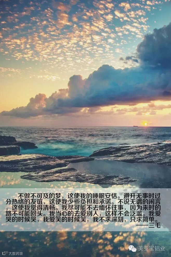 不做不可及的梦,这使我的睡眠安恬。避开无事时过分热络的友谊,这使我少些负担和承诺。不说无谓的闲言,这使我觉得清畅。我尽可能不去缅怀往事,因为来时的路不可能回头。我当心的去爱别人,这样不会泛滥。我爱哭的时候哭,我爱笑的时候笑,我不求深刻,只求简单。
