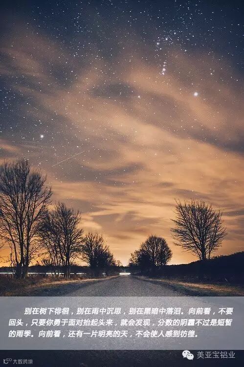 别在树下徘徊,别在雨中沉思,别在黑暗中落泪。向前看,不要回头,只要你勇于面对抬起头来,就会发现,分数的阴霾不过是短暂的雨季。向前看,还有一片明亮的天,不会使人感到彷徨。——莎士比亚