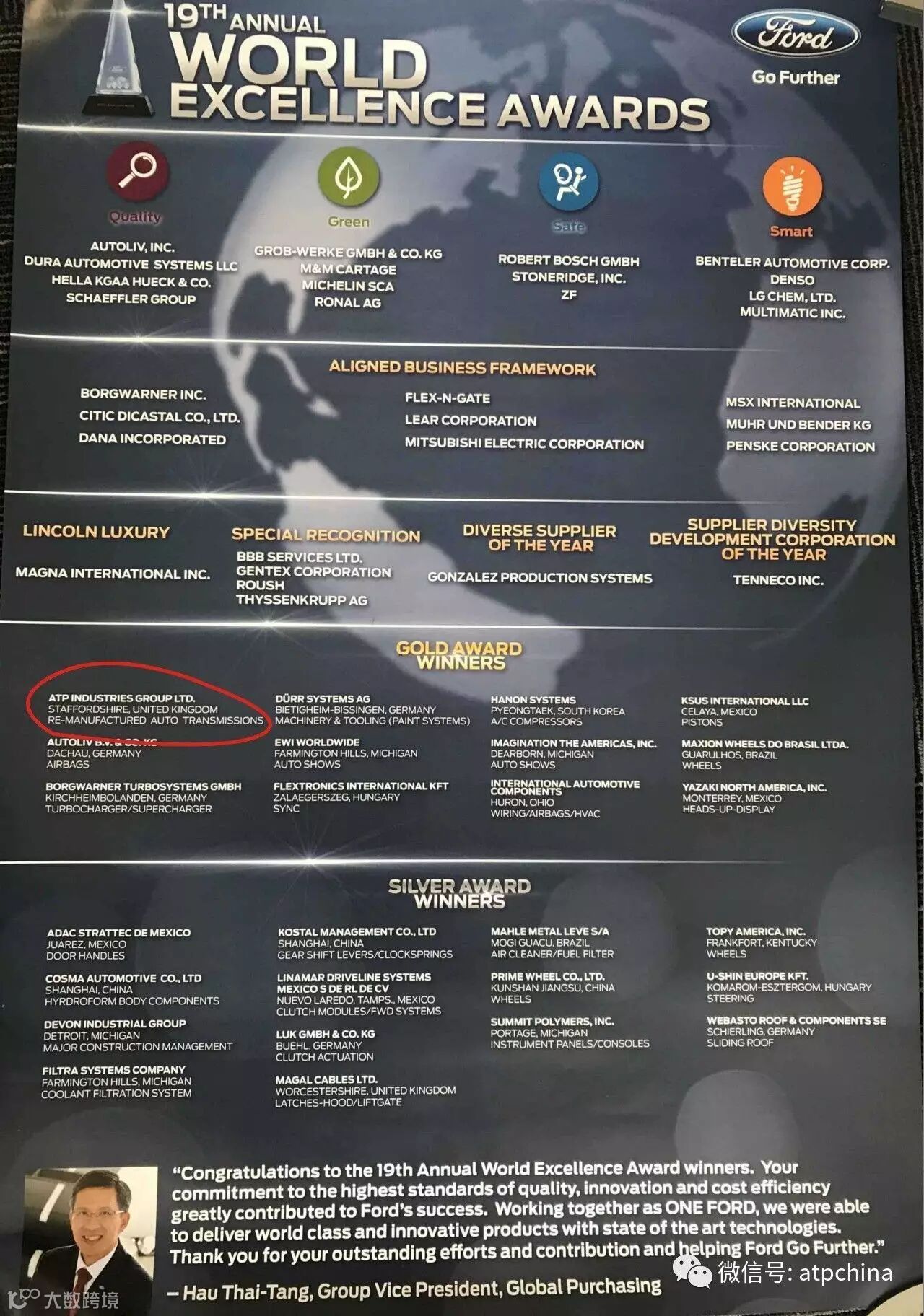 2017年5月16日,在美国密歇根州迪尔伯恩市亨利-福特博物馆举行的第19届福特世界卓越供应商颁奖典礼上,ATP工业集团有限公司荣膺2017年度Ford World Excellence Award(福特世界卓越供应商金奖),福特汽车产品开发及采购执行副总裁Hau Thai-Tang(左)和福特汽车执行副总裁兼北美执行总裁Laj Nair(右)共同向ATP集团运营总监Tony Peck颁发了奖杯!