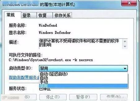 在键盘上同时按下“WIN”和“R”键,在弹出的对话框里输入 “Services.msc”,点击确定后我们就能看到一个界面。Win7的各种系统服务程序都集中在这里,我们可以选择对其关闭或者打开。在这里面找到“Windows Defender”,双击后会弹出一个对话框,点击“启动类型”,在下拉菜单里选择“禁用”,整个系统服务就被停止了。Windows Search和Volume Shadow Copy的禁用方法与此类似。