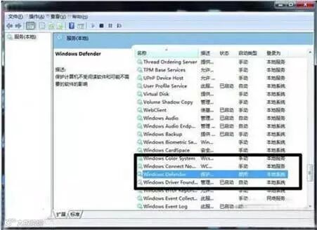 Win7中堪称“硬盘杀手”的系统服务主要是以下3个:WindowsDefender,Windows Search,以及VolumeShadow Copy。Windows Defender是Win7自带的系统保护软件,主要功能就是清除简单的木马和流氓软件,只要电脑上安装了杀毒软件,它就不太重要了。