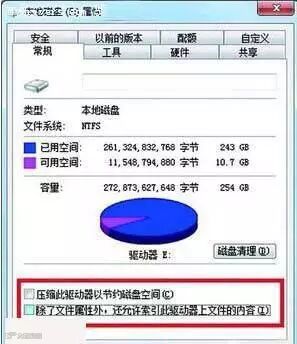 鼠标右键单击硬盘盘符,在菜单上选择“属性”,在弹出的界面上,将“压缩此驱动器以节约磁盘空间”和“除了文件属性外,还允许索引此驱动器上文件的内容”这两项前面的小钩去掉。之后点击确定退出。不过这样的操作建议仅针对非系统盘,比如我们用来存储电影或音乐的D,E,F盘等,系统盘还是保留原样比较好。将小框里面的钩去掉即可!