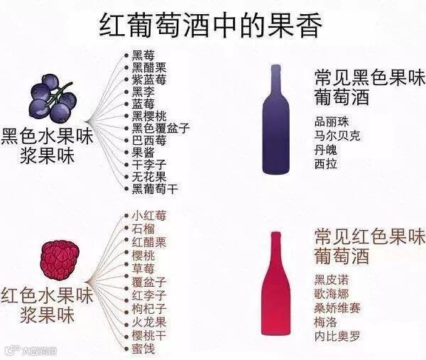 红葡萄酒(陈年的波尔多):香气中等,散发出黑醋栗、黑莓、樱桃等果香,萦绕着玫瑰干花香,伴有香草、雪松以及一点点皮革的气息。