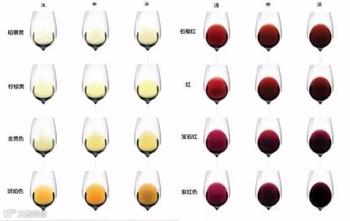 常见的白葡萄酒一般为柠檬色,随着陈年时间的增加,酒液颜色会越来越深。按照年轻至年老,酒款可以分别呈现出浅柠檬色、中等柠檬色、浅金黄色、中等金黄色、浅琥珀色和深琥珀色。