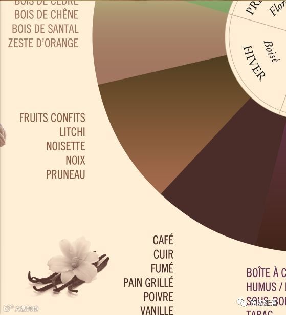 冬季香:雪松木、橡木、檀香、橙皮;蜜饯、荔枝、榛子、核桃、西梅干、咖啡、皮革、烟薰、烤面包、胡椒、香草。