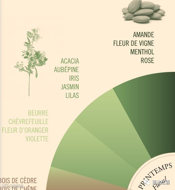 春季香:牛油香、金银花、橙花、紫罗兰;百花、山楂、鸢尾花、茉莉花、百合花;杏仁、葡萄花、薄荷、玫瑰。