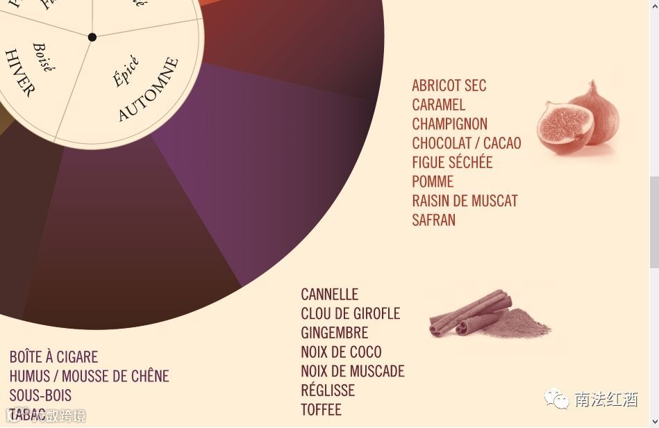 秋季香:杏果干、焦糖、蘑菇、巧克力/柯柯、无花果干、苹果、麝香葡萄、藏红花;桂皮、丁香、姜、椰子、肉豆蔻、甘草、奶糖;雪茄、橡苔、深林灌木丛、烟草。
