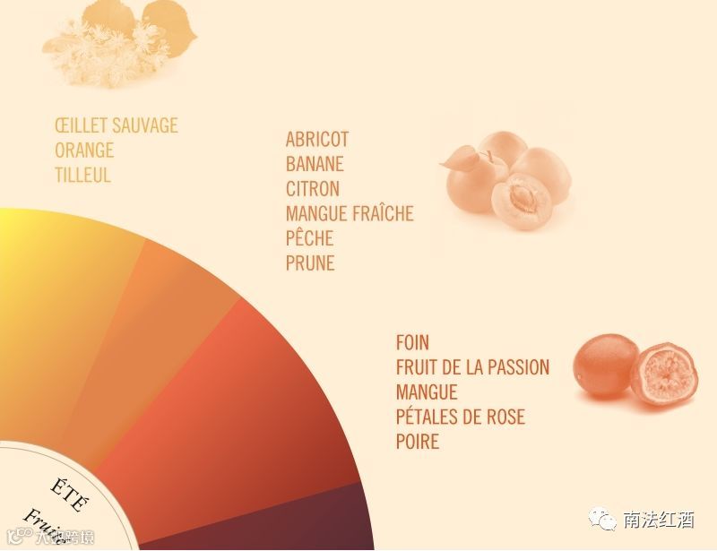 夏季香:野生康乃馨、橙、椴树;杏果、香蕉、柠檬、芒果、蜜桃、西梅;干草、百香果、芒果、玫瑰花瓣、香梨。