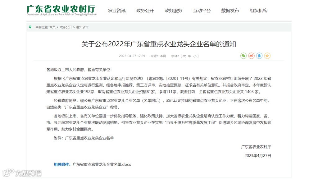 近日,广东省农业农村厅发布《关于公布2022年广东省重点农业龙头企业名单的通知》,温氏股份通过2022年广东省重点农业龙头企业认定!