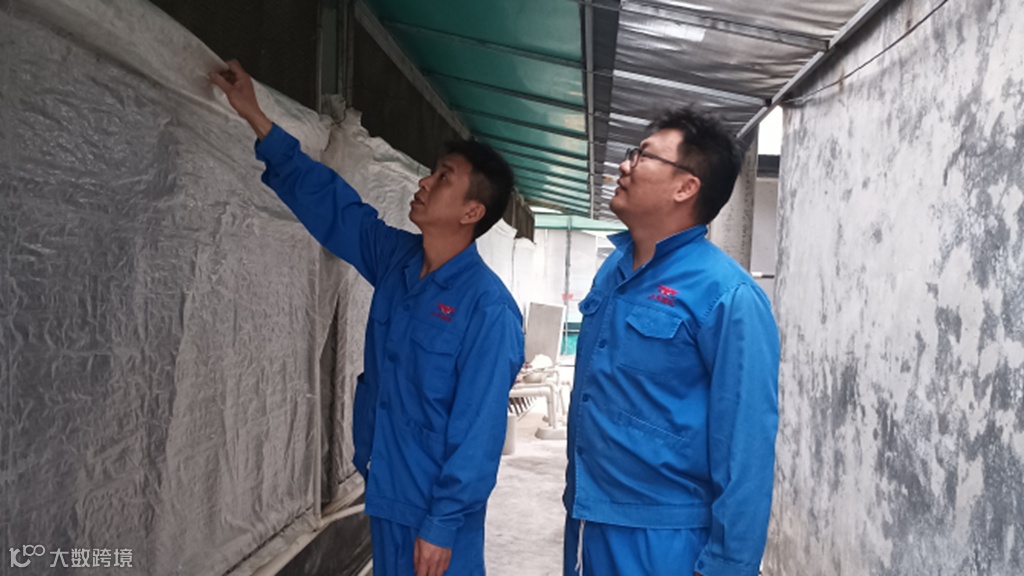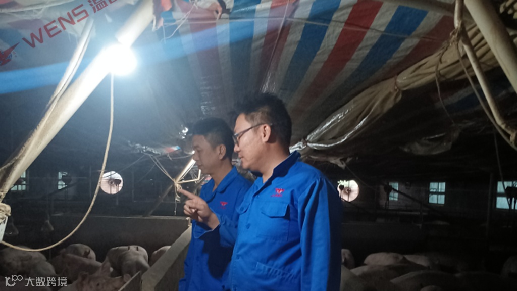 农户服务员与黄起杰一起检查猪舍硬件情况