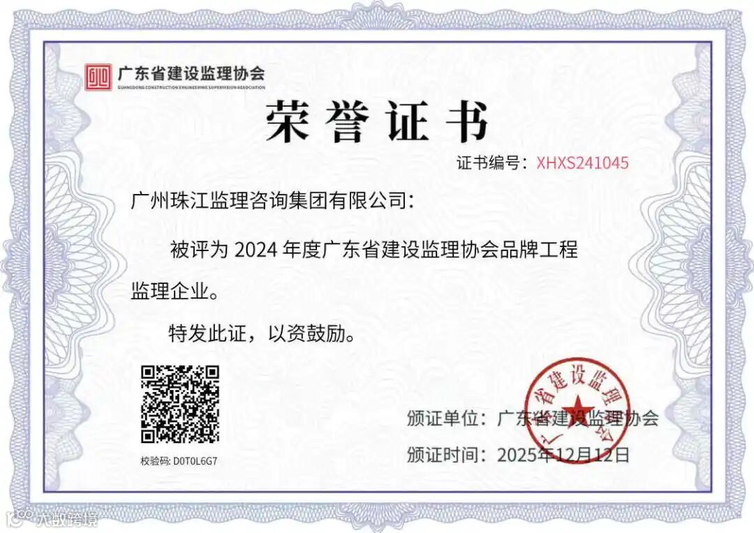 近日,广东省建设监理协会公布2024年度选树活动结果,广州珠江监理咨询集团有限公司(下称珠江监理)凭借卓越的综合服务能力与行业影响力,荣获“2024年度广东省建设监理协会品牌工程监理企业”称号。同时,林才、林贤槟、罗声烈、莫渺当、赵雪红等5人获评“优秀总监理工程师”,代飞、何炳佑、吕兵兵、夏延述、徐柳杨、严其华等6人获评“优秀专业监理工程师”。