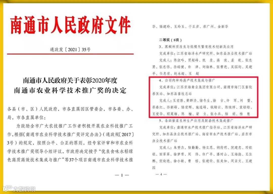近日,南通市人民政府发布了《南通市人民政府关于表彰2020年度南通市农业科学技术推广奖的决定》。在获奖项目名录中,由京海禽业牵头,总经理王宏胜主持的“白羽肉种鸡高产技术集成与推广”项目荣获南通市农业科学技术推广二等奖。
