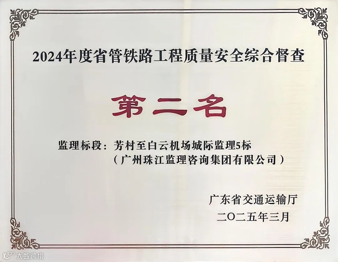 在广东省交通运输厅组织的2024年度省管铁路工程质量安全综合督查中,由珠江监理负责的芳村至白云机场城际工程监理服务项目5标(以下简称“芳白城际5标”)从全省63家参评监理合同段中脱颖而出,荣获综合排名第二名的优异成绩,获颁广东省交通运输厅表彰牌匾。这一荣誉不仅是对项目团队专业能力的肯定,更是珠江监理践行“精细服务、科学管理、安全环保、客户满意”三标一体管理方针的生动体现。