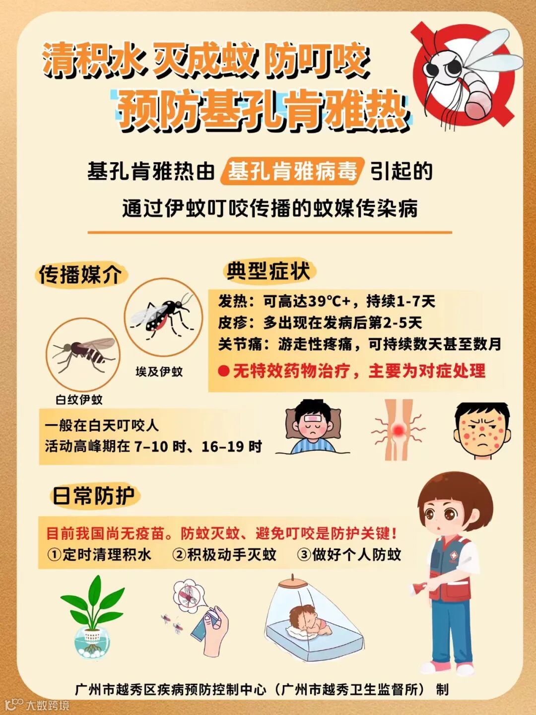 基孔肯雅热是一种由基孔肯雅病毒引起的急性传染病,主要通过伊蚊(身上有黑白花纹的“花蚊子”)叮咬传播,各年龄段人群均有可能感染发病。有什么症状?如何预防?