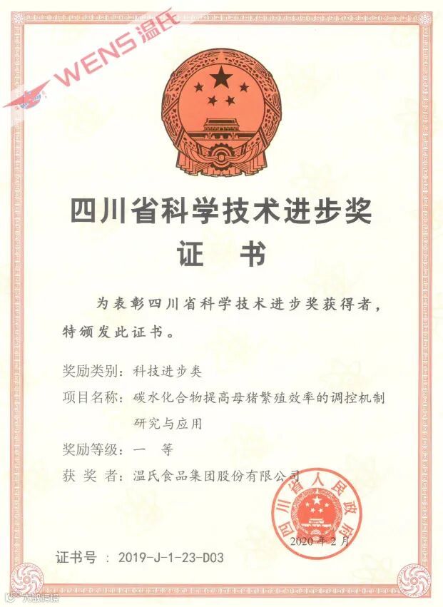 由四川农业大学、中国科学院过程工程研究所、温氏股份等共同完成的“碳水化合物提高母猪繁殖效率的调控机制研究与应用”获得四川省科技进步一等奖,并于日前收到该奖项证书。