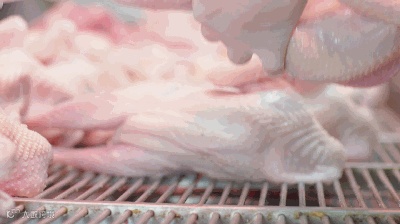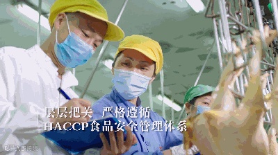 在屠宰生产线,这些鸡经过44道生产工艺,每道工艺层层把关,严格遵循HACCP食品安全管理体系。屠宰后的光鸡还要再经过一次检验检疫才能流入市场。