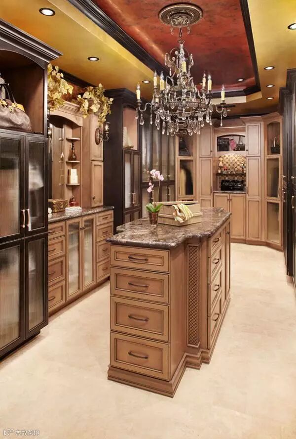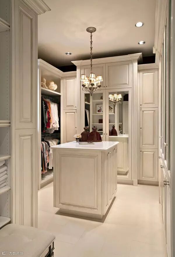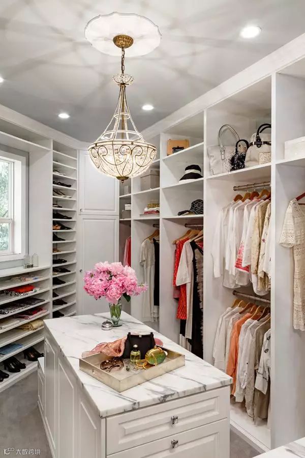 欧式的衣帽间设计,给包包、衣服、鞋子划分了区域。加上精致的吊灯、换鞋凳和地毯,是女生衣帽间不错的设计选择。