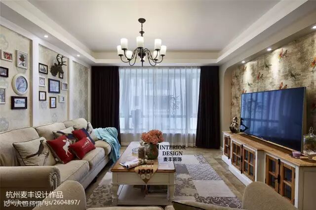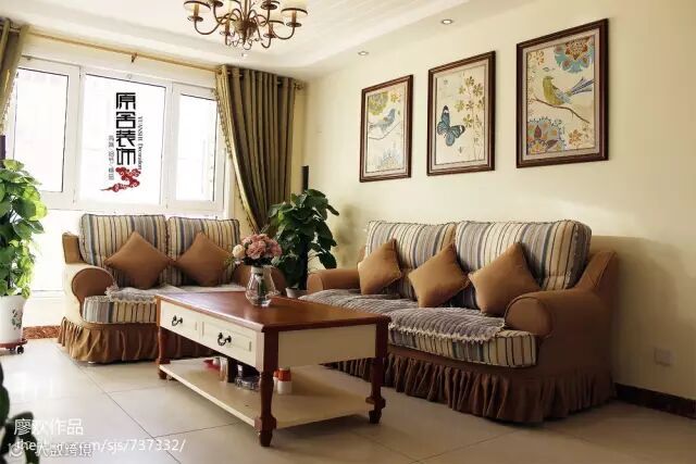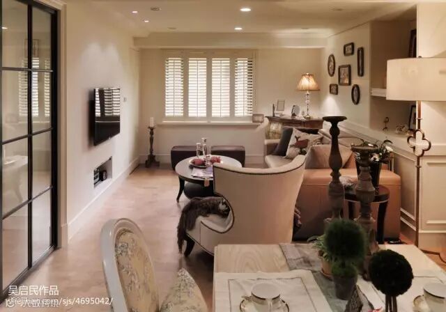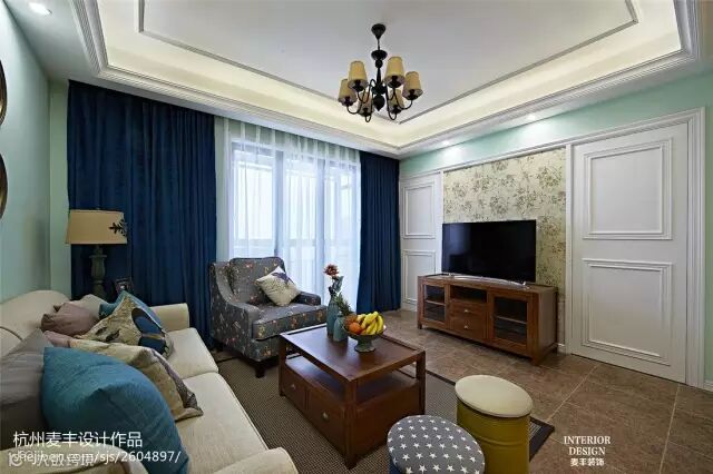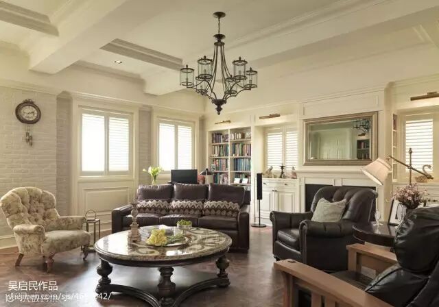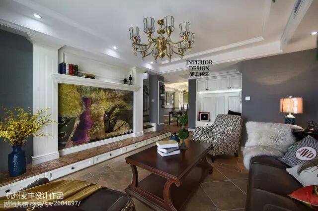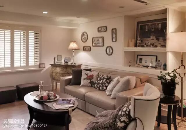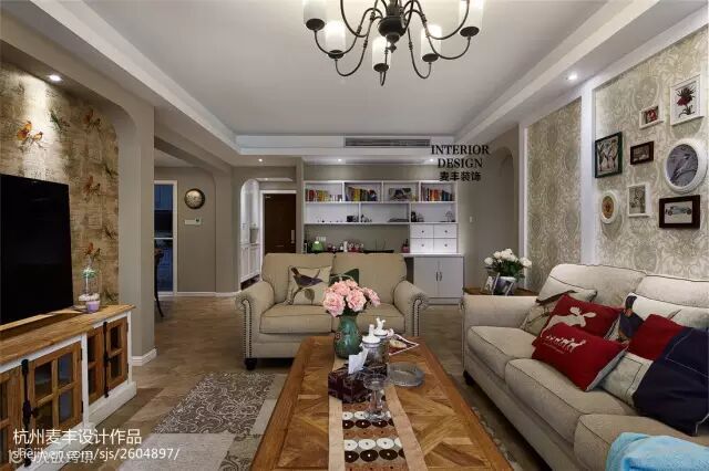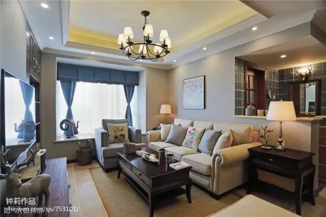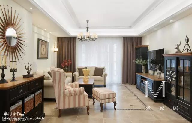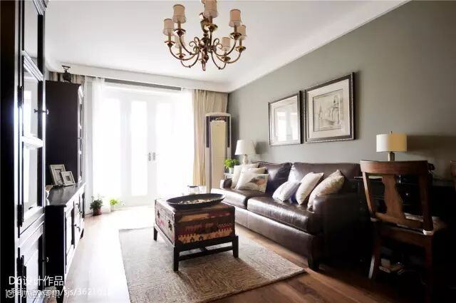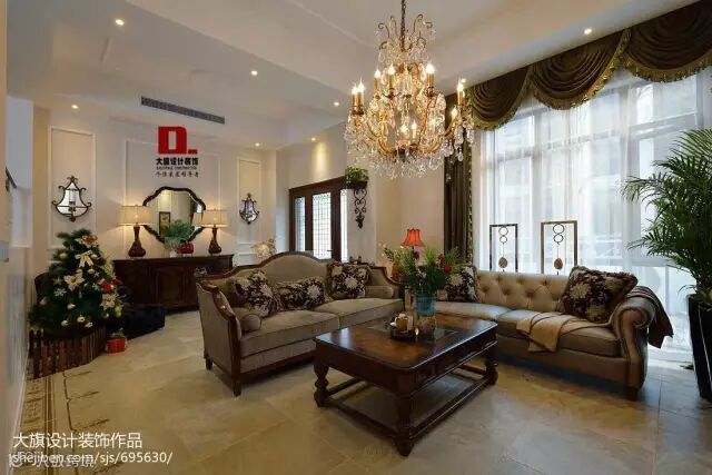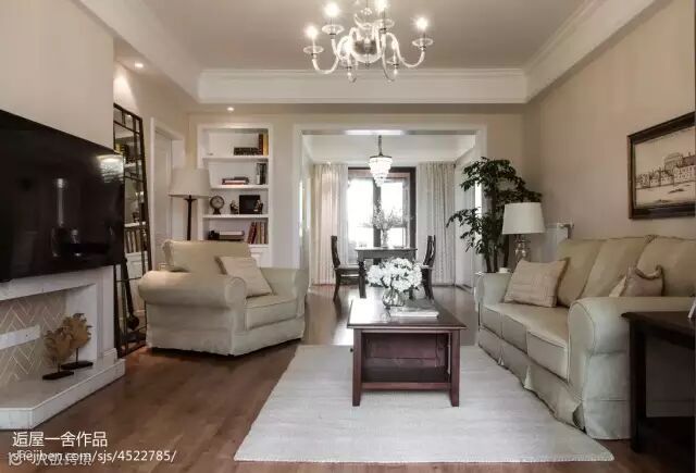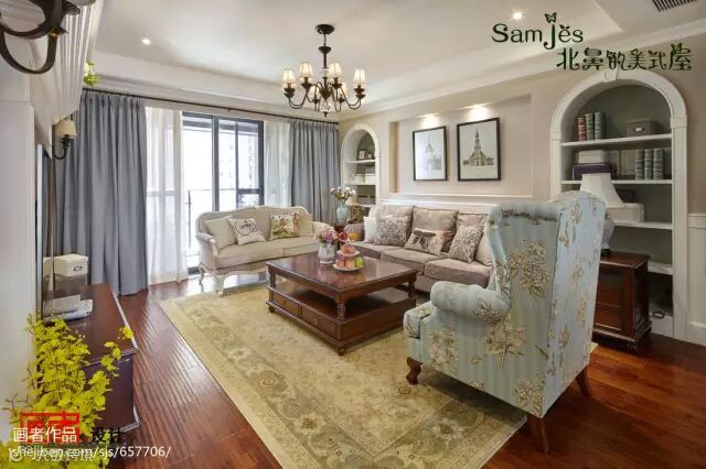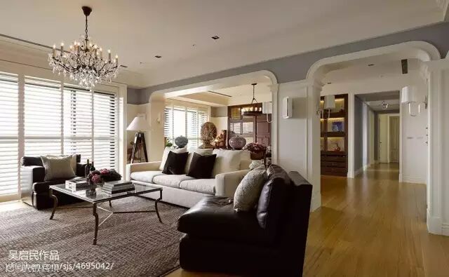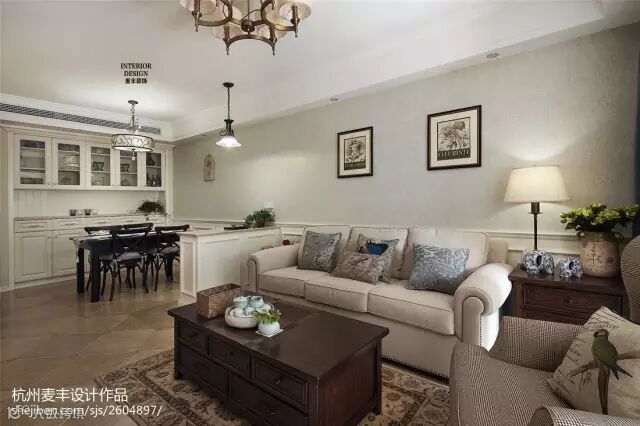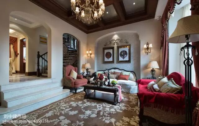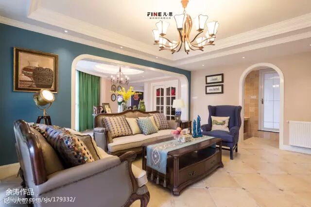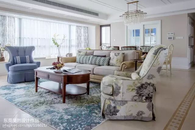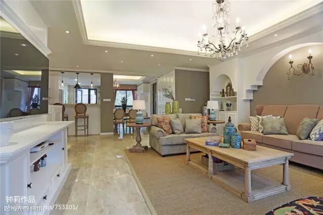 客厅的色彩以自然色调为主,绿色、土褐色最为常见,壁纸多为纯纸浆质地;家具颜色多仿旧漆,式样厚重;设计中多有地中海样式的拱。在古典中带有一点随意,摒弃了过多的繁琐与奢华,兼具古典主义的优美造型与新古典主义的功能配备,既简洁明快,又温暖舒适。