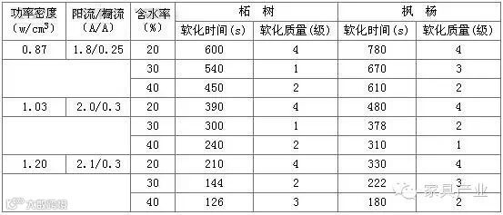 木材软化时间随着功率密度、木材含水率和树种的不同而有很大差异。其中功率密度对软化时间影响最大,它直接决定了木材所得加热功率的大小。功率密度越大,木材加热越快,需要的软化时间就越短。