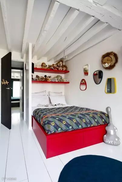 樱桃红的床、搁板与镜框点缀在纯白的儿童房中,彰显活力而节奏明快。