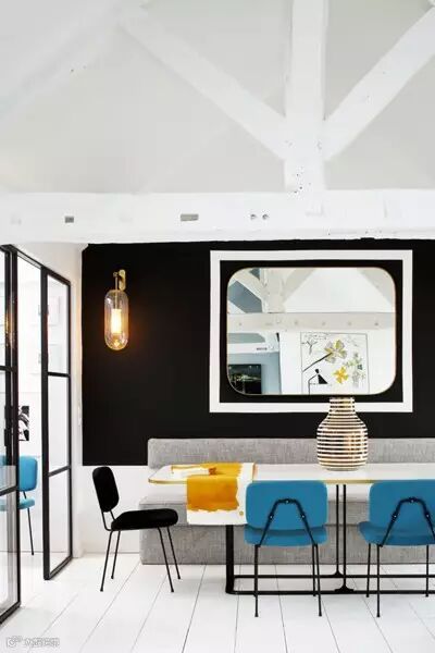 在餐厅,餐桌的桌腿与黑色墙壁上的白色墙镜图案交相呼应,下方是Sarah Lavoine的Jacob长椅。
