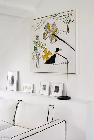 沿楼梯而上,摄影作品、不规则的条纹地毯、古董店淘来的斯堪迪纳维亚扶手椅……构筑起这个白色空间中1/3的黑色配色。