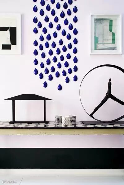 结构简洁而惊险的黑色船用楼梯,把视线吸引至大片的复古蓝背景。楼梯下,跳蚤市场淘来的镜子,以另一种角度折射出门口的艺术品。