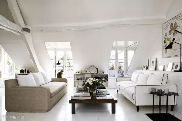 客厅从地面到墙壁到木梁,都被油漆成白色,能折射外部景色的三角形镜面被安置在角落,延伸着客厅的景深。