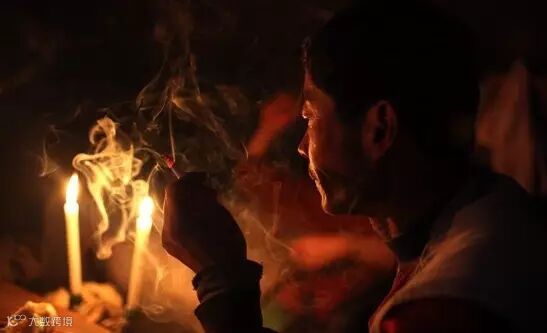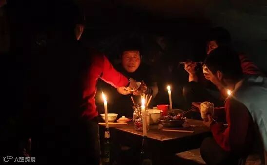 ▍由于没有电,在工棚吃晚饭要点着蜡烛。为了抵御寒冷维持体力,大家都要喝点白酒,吃一些肉。图为晚上,大家点着蜡烛在工棚吃晚饭。