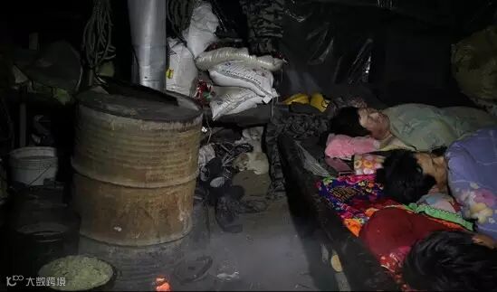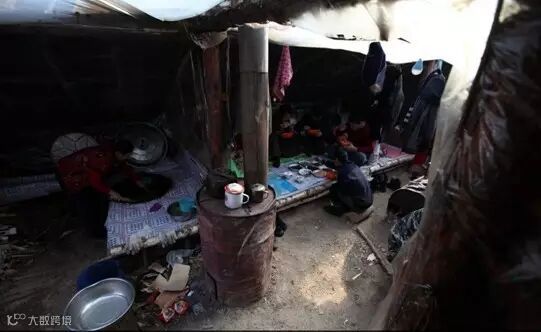 ▍早上5时许,工棚内温度很低,由于塑料帐篷内很不保温,夜晚取暖靠一个铁桶改制的火炉,炉火旺时,温度较高,睡熟后,炉火就会熄灭,夜里常会被冻醒。图为火炉里所剩的余火不多,两只小狗蜷缩在工棚的一角。