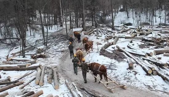 ▍工人用牲口将砍伐完的木材运到路边,以便运走。