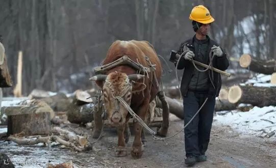 ▍由于林木太过粗大,不得不用牲口将木头拉出。