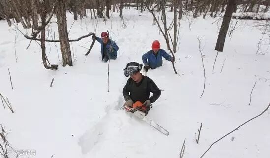 ▍山上采伐点儿距山下的工棚约2.5公里,虽然不远,但举步维艰,需行走一个半小时。伐木队艰难的踏过齐腰深的积雪,拿着工具艰难的在山上行走。