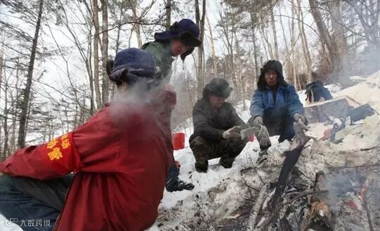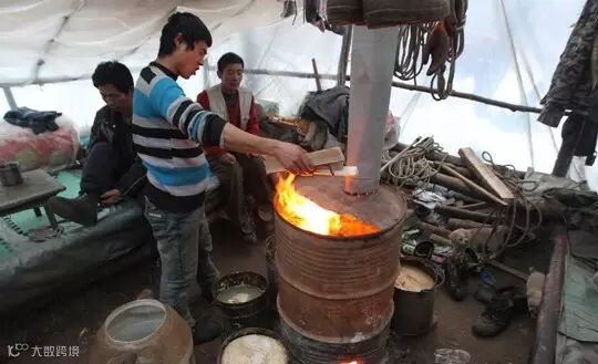 ▍由于雪大路远,工人午餐只能在户外,为了取暖大家经常围着篝火吃饭。